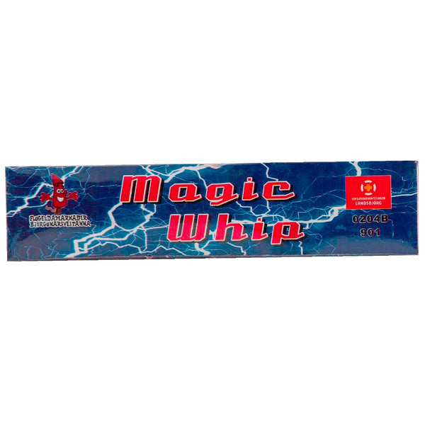 Púðursvipa með kveik á öðrum endanum. Hvellir og leifturljós.